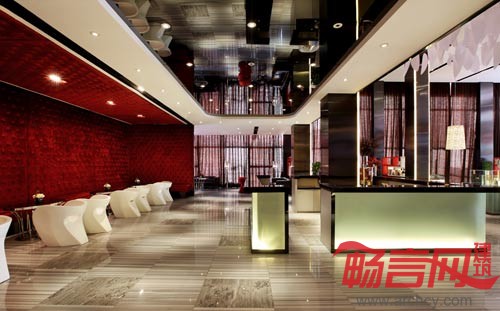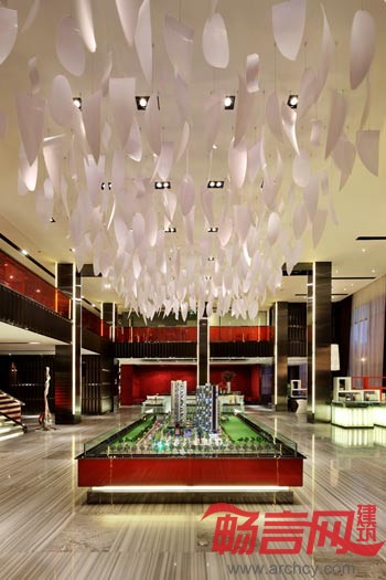 设计师运用红色、白色、黑色及天花白色芽状造型来表达设计的概念,红色给人活力激情的视觉感官,白色体现青春的单纯;天花上密集的白色亚克力吊饰,像一群洁白的正在发芽的生命体,活力,青春,时尚。地面直纹白云石柔化了红色玻璃的强烈视觉效果,产生更多的细致变化。