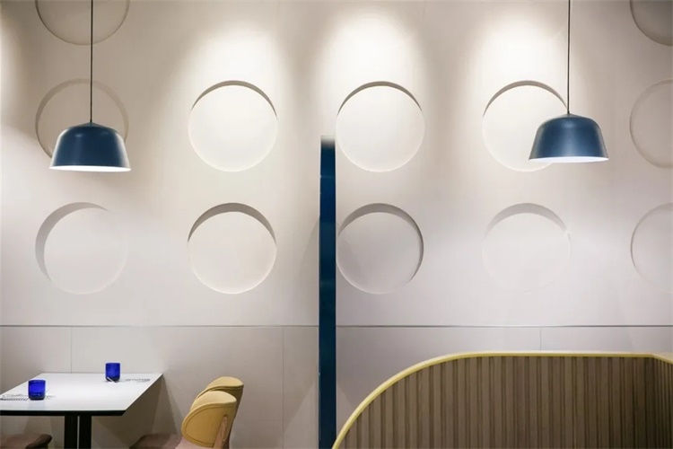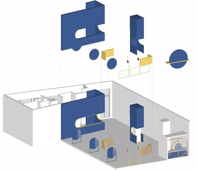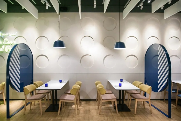 空间内的造型设计,贯之“披萨几何”的设计概念后,顿然生趣,实现了由平面几何与层次的拼接,到平面层次在立体空间中的变化,现代简约,时尚活泼。