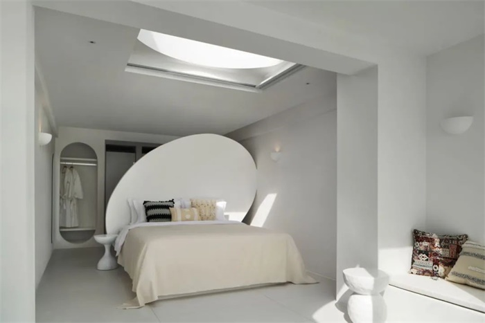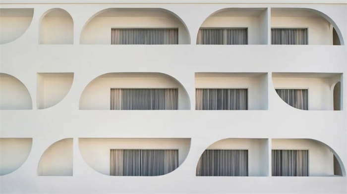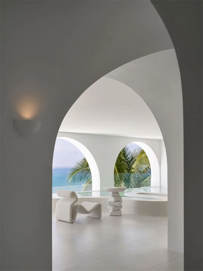 酒店立面上分布着弧形窗户和阳台,使人联想到滚滚波涛;立面涂有清爽的白色,与周边海天浓郁沁人的蓝形成鲜明对比。酒店负一层,一系列倒置拱门沿着毗连无边泳池的平台木板延伸。宽敞的屋顶露台和一层大堂有更多泳池;在大堂,踏脚石通往边缘弯曲的室内泳池。大堂光线充足,装点着几盆盆栽,放置着一系列白色雕塑扶手椅和配套边桌。