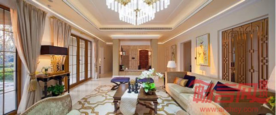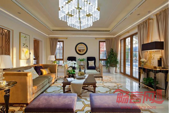 一层为敞阔的英式会客厅,客厅宽达2米的巨型水晶吊灯,宽大的沙发和几案,随处安放的欧式风格摆件、挂画,墙面装饰镜经过色彩和线条处理后,与经典的拼花地毯相呼应,英式的优雅与精致在所有的细节上的用心显得更加到位,气韵自然流转。