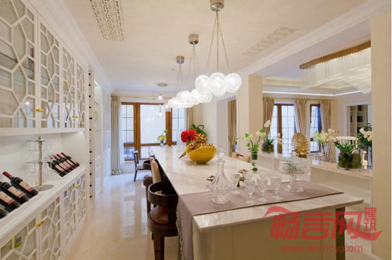 品酒区与家庭室相连,设计在复古中建立一种明朗干净的现代审美,以白色为基调,轻盈的吊灯,精美的杯盏和花艺,无不体现主人深厚的艺术文化内涵及精致的生活品味。