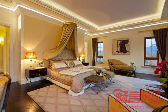 相对于公共空间,私密的卧室设计更加注重营造内心与情感的交流与对话。主卧位于二层,简练直挺而富有生命悦动感的迷人线条,奢华的帷幔和舒适的床品面料,香槟色柔和魅惑,经典与现代的交织。