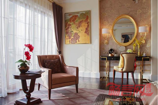 整个空间将维多利亚女王时代的经典优雅与现代空间的时尚简约融汇,让奢华与艺术以简洁庄重、严谨合度的方式呈现。室内采用雅致的米色、清新的白色为主色调,呈现现代美学表情;大面积的咖色软包点缀浪漫紫色,配以高贵的金色与冷静的黑色,丰富空间彩度,营造贵族气势;内部装饰集水晶、铜艺等元素与精美细节于一体,使空间呈现出独特气质。