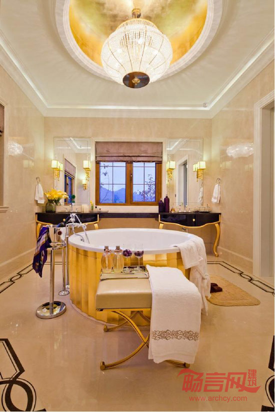 地下一层为家庭室,品酒区和SPA区。家庭室墙面整体设计较为简约,然而软装撞色装饰令空间显尽英式贵族的华贵典雅,镜面与金属交陈的剔透空间,在曼妙光影的水晶吊灯的映射下,却备显奢华雅致。