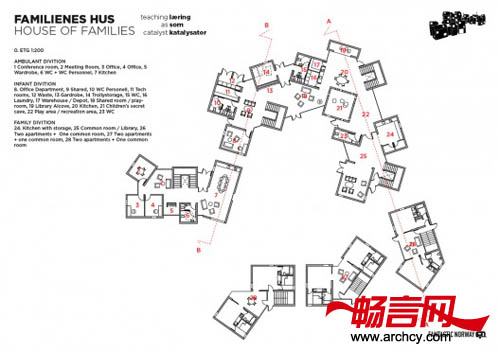 建筑布局的宗旨就是要为单身母亲河孩子创造一个良好的学习和生活环境,并有利于他们未来的生存。创造一个让他们学习自力更生的环境,让他们能慢慢学着养活自己,并最终能够独立生活。这个项目规划了许多公共区域,以便建筑里的居民彼此可以经常见面。这些区域包括厨房、小院子、起居室等等,这些都有利于人们的交流,能促使这里的居民重新融入到社会当中。