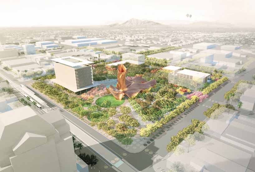 由WEST 8景观事务所,Colwell Shelor公司以及Weddle Gilmore公司组成的设计团队共同完成了美国亚利桑那州MESA市中心广场开发项目。该方案响应了某国际竞赛的号召,将参与由另外两个参赛方案的竞争。项目旨在创造具有外表特色的公共空间,提供有序和被动式功能,促进该地区的未来发展。方案围绕中央聚集点,提供一个连贯的黄铜外观的名为“风舞者”的项目。这一生动的枢纽项目将会高效的分期完成,从而节省公共资金。预计今年10月将产生项目优胜方案。