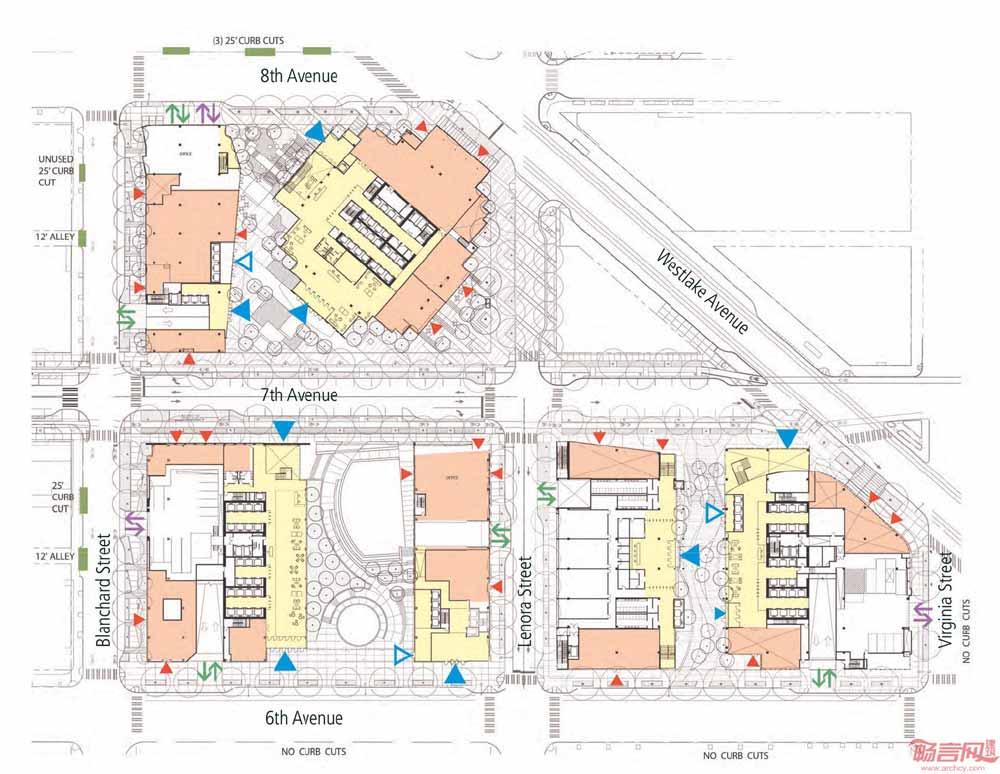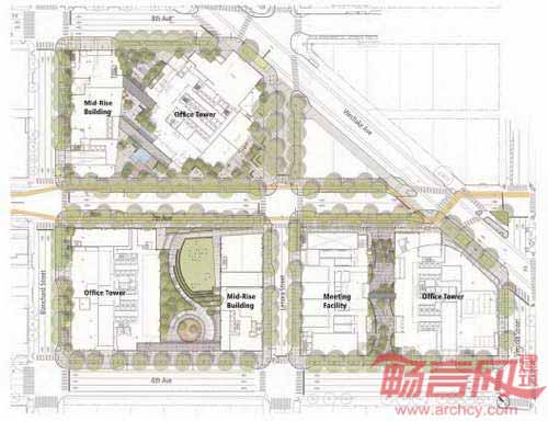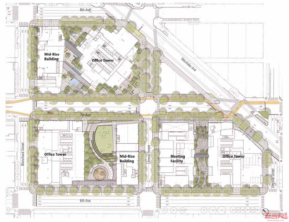 NBBJ建筑事务所为亚马逊公司总部进行了建筑设计,总部位于美国西雅图市中心,设计方案将以前散布的建筑整合成3个版块——高层塔楼、若干开敞空间以及景观广场。项目面积约为30.7万平米,详尽的设计方案已经呈交给西雅图设计审核委员会(DRB),其中明确划分了各建筑的分区,介绍了建筑融入城市肌理的方式,并包含Denny’s Triangle地区的综合开发分析。