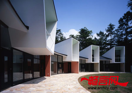 M小住宅群面向一条繁忙的街道,这里经常有游客的车辆和公交车经过,在夏天尤其繁忙,但是在花园那一侧却有一个十分静谧、宜人的森林。三户有女儿的家庭住在这里,每家单独住在住宅群里的一户,但是他们三家共同享有后面森林的美丽景致,都能观看到森林里的小动物。