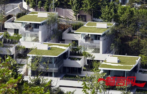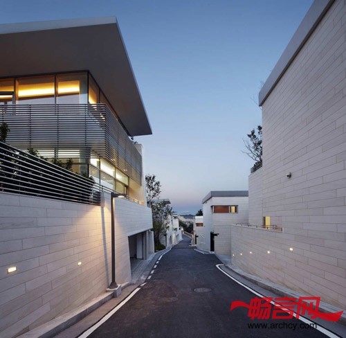受建筑地块的影响,住宅群的设计将传统的韩国建筑与现代建筑语言融合起来。沿着住宅群区内街道的连续的石墙,它保护着每个住宅主人的隐私,就好像古代的堡垒保护着宫殿一样。而且,每间住宅悬臂出来的屋顶悬在石墙之上,这种样式仿照了古代亚洲城市的街景设计。