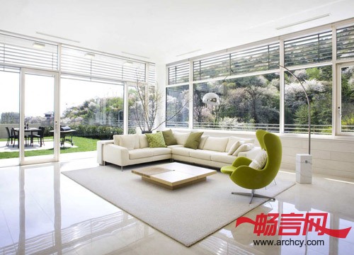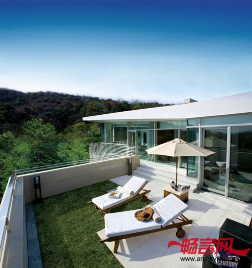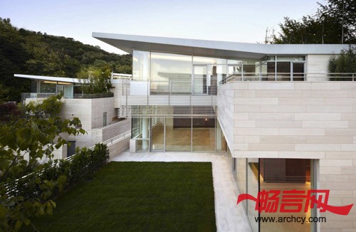 室内和室外空间设计仿照了韩国古代宗祠的布局,每四个不同的单元类型围绕着两个院子而建,庭院是户外生活区域,它将每个住宅语气前面的景观连接了起来。材料的颜色和整体视野设计将从露台到生活区域的各个部分在视野上都连接到了一起。和室外一样,室内也是用了天然实质材料,它与木质地板相接。玻璃墙让室内和室外连接了起来。