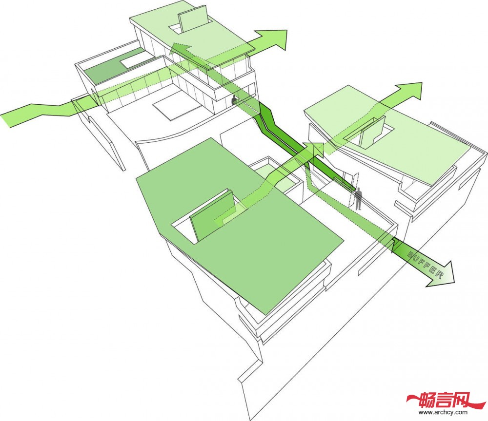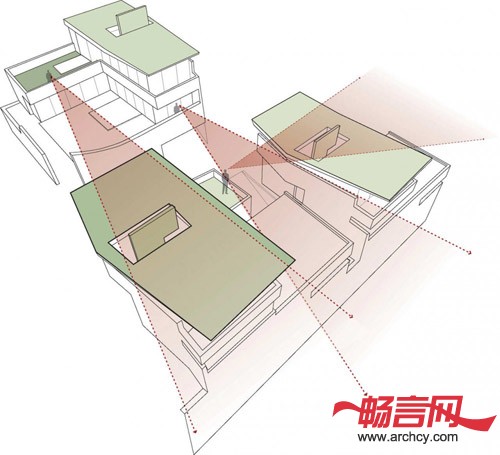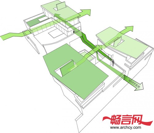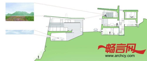 该项目的设计借鉴并创新了古代的“借来远景”的设计方法——一种古代亚洲的园艺师进行建筑规划和布局的技术,这样能营造出一种将前院的私人花园和远处的自然景观连接起来的感觉。各个L形的住宅错开排列,这样就能保证每个住宅都能毫无阻碍的看到南方的森林山谷,每一个住宅的邻居前面庭院的绿色屋顶将近景与远景连接了起来。