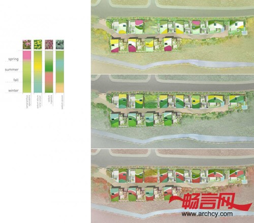 每个住宅的屋顶上都种植了不同的景天属植物,植物按照网格样式布置。从山谷对面的国家公园看,在不同的季节,屋顶上的各种植物会有不同的颜色,不仅让屋顶显得活力多姿,同时又将住宅群与周围茂密的森林山脉连接了起来。