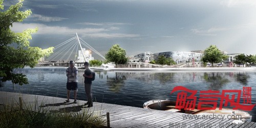 依据各自的区域特点,这3各区域的建筑风格也不尽相同。其中,体育场北边的区域被打造成一条全新的城市风景线。BIG在这里设计了一群建在水面上的房子,每座房子由高度不等的柱子支撑,这些房子的底层主要用于办公、商务和文化活动,而上面的楼层则用于居住。