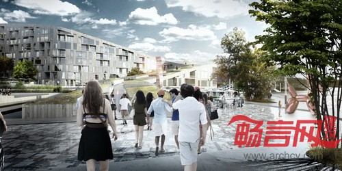 另一个区域位于半岛的岛尖部位,建筑物的中间有一片绿化庭院。这片环形建筑群有两端的屋顶是与地面相接的,便于人们爬上屋顶,到高处欣赏城市美景。第三块区域主要分布着办公楼、零售商店和文化活动区等等,建筑物外墙都安装了水平百叶窗。