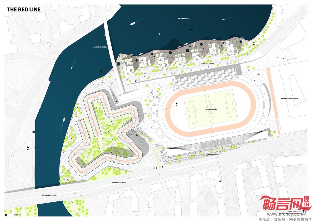 “我们遇到的难点就是如何避免公共空间的区域私有化。于是我们设计了一条线状的公共区域,像一条红线一样将3个不同的区域连接起来,”BIG创始人之一Bjarke Ingels说:“在这片公共场所,人们可以沿着水边散步,也可以顺势爬上屋顶欣赏坦佩雷的城市风景。这个‘三维的’公共场所不仅为这片城区注入了运动活力,也为Ratina体育场引入了城市生活的元素。”
