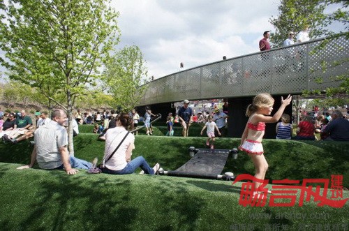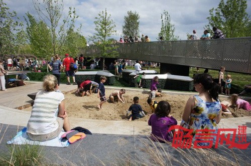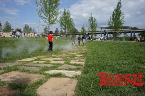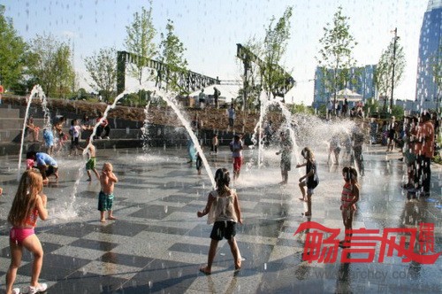 这个公园适合不同年龄阶段的孩子玩耍,这里有沙地、有波浪形的草坪、还有用植物组建的绿色迷宫;一座“云桥”下面,有人工水帘、还有喷泉和浅水滩,人们可以在这里享受清凉和畅快。这里的照明灯是按照各种星座图案组合的,为公园增添了一份独特的景致。