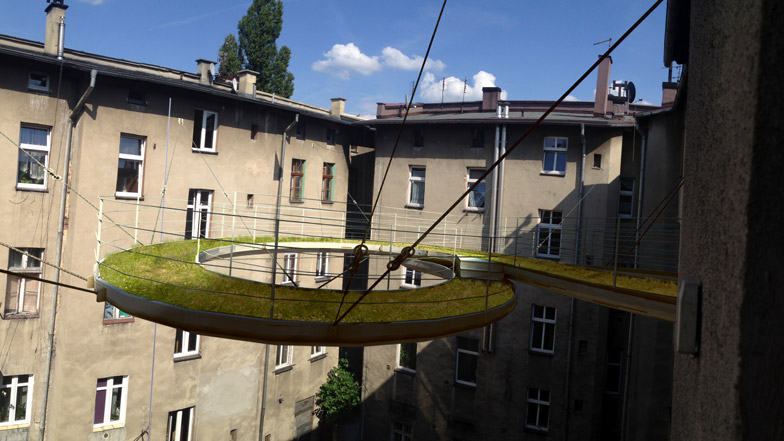 一成不变的视野令人厌烦,Zalewski建筑事务所为了改变这种状况,在工作室外添加了一个空中走道,这样不必离开建筑,就能惬意的休闲散心。事务所位于波兰南部的Gliwice,坐落于一座建筑的三层。在一个炎热的夏日,设计师面对无趣乏味的庭院,渴望创造一个舒适的户外空间。设计师构想出80厘米宽的走道,从一个窗户蜿蜒而出,沿着庭院方向回环,返回另一端。走道由系绳悬吊,邻近建筑的墙壁提供了支撑。