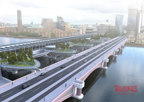 Wride想到了利用黑衣修士桥旁边的几个多余桥墩,在泰晤士河上打造四个树叶状的景观平台,每个观景平台都是一个独立的花园。这四个平台位于现有的公路大桥和相邻的铁路大桥之间,既形成沿河景观,又通过轻型桥相互联通。