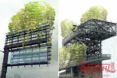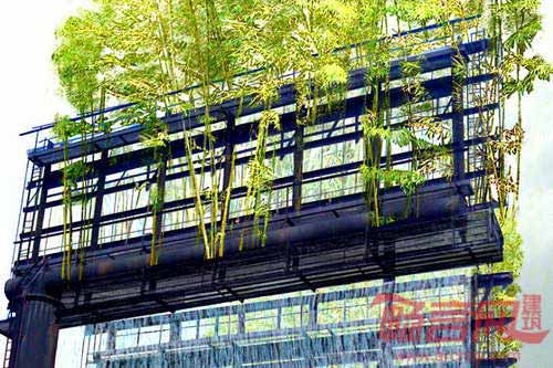 广告牌如同手表,尽管常常看到,却没有意识到它们的存在。但是设想下:广告牌上出现的不是空洞的广告,而是与茂密的花园相结合?洛杉矶艺术家Stephan Glassman试图将普通广告牌改造成高空竹子花园,为平凡的街景增添绿意。Glassman同工程师、竹子材料专家和一家广告牌公司组成的团队合作,创造出Urban Air空中花园。公园特色的配备了Wi-Fi连接设备以及气候监测系统。团队正在通过Kickstarter公司筹集资金,希望将竹子花园项目在加州地区进行推广。
