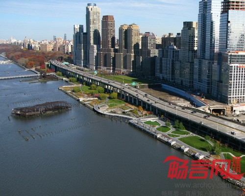 在纽约曼哈顿区的哈德孙河畔,有一个漂亮的河畔公园。这个公园由Thomas Balsley设计公司和Skidmore, Owings and Merrill公司联合设计,两家公司负责设计的区域面积分别为23英亩和65英亩。