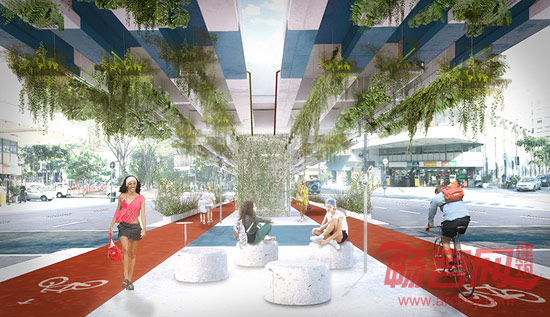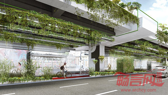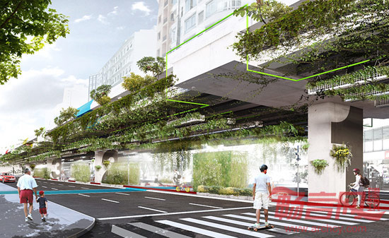 项目基本上围绕两方面展开,一方面增加自然采光,另一方面在高架桥上悬挂绿植,这可以吸收20%的车辆排放二氧化碳。