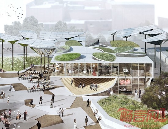 项目地块目前处于闲置状态,建设该项目旨在为洛杉矶市区提供一个能够进行艺术、饮食和交流等活动的多功能绿色空间。OMA将公园设计为一个中央广场,并配备了形象而有趣的雕刻般的反光顶棚,在提供阴凉的同时也增强光线。此外,公园里还种植了橡树和美国梧桐树。公园里的座位墙呈曲线布置,犹如一条起伏的彩带。