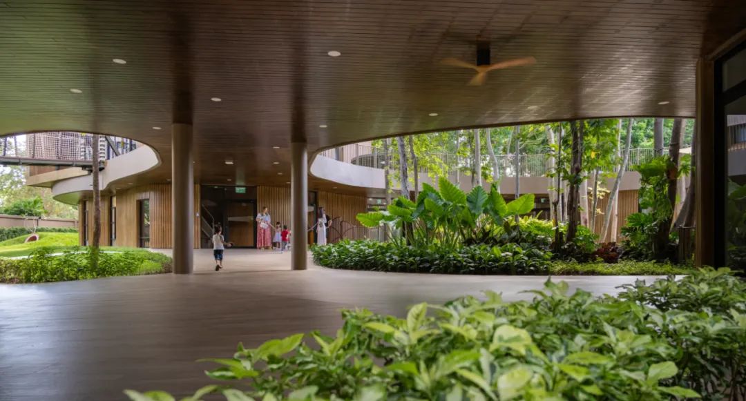 建筑底层主要分为三个区域,包括 3 岁以下的儿童区、幼儿园区和入学区。每个区域都有独立的活动庭院,教室后面还有室外学习空间,整座建筑环绕在绿色植物丛中。每个教学班级前方还设置了室内游戏空间,适用于多种场合,例如在空气质量较差的情况下,或因热带气候而出现的大雨和过度炎热等极端天气中均能使用。