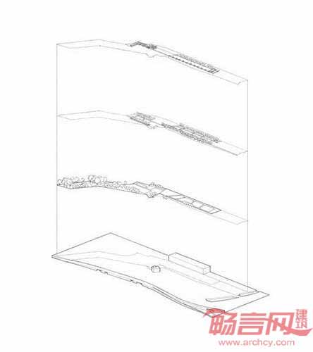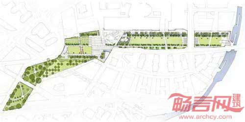 设计方案包含了一连串界限分明的空间,之间添加设计合理并令人愉悦的通道,同时由于纵横方向不同的功能,具有分别的层次和涵义。公园的长边赋予其连贯的建筑叙事风格,而另一侧给予人们穿越绿野的机会。
