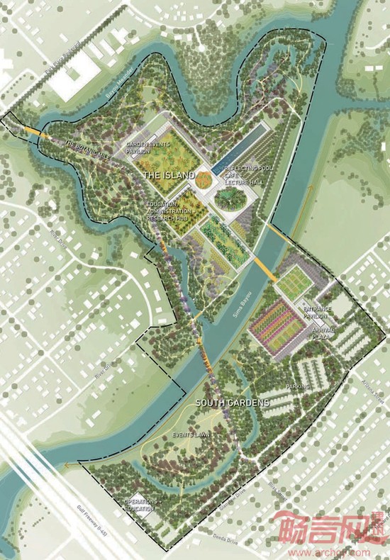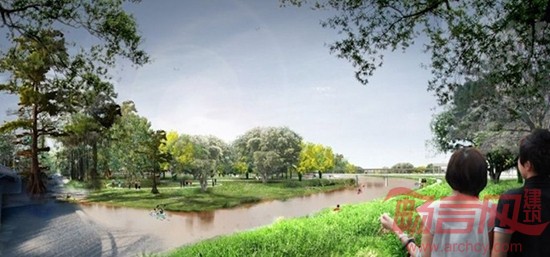 沿着现有的道路,将建设步行道和自行车道,并且与城市道路系统相连。一座顶部栽满树木的拱桥将横跨Bayou河。