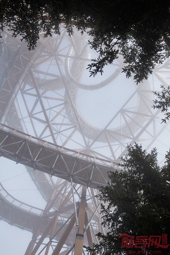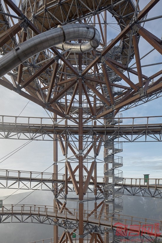 沿着盘旋而上的木制坡道,步行者和乘坐轮椅的人们都可以轻松地到达塔顶。此外,有冒险精神的游客还可以使用长达101米的不锈钢滑道,该滑道呈管状结构,并且配备有窗户。