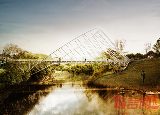 设计师Alex Daxbock和Chris Precht为英国Salford桥设计竞赛提交了设计方案。方案中,从桥的一侧来看,桥体结构就是一个普通的拉索桥结构,但是当你走近桥的入口处,就会发现一个巨大的椭圆形结构。