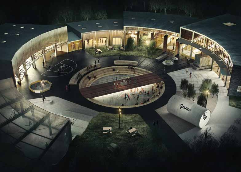 EFFEKT建筑事务所赢得了丹麦西南部Esbjerg街道体育设施的竞赛优胜。项目计划将一个废弃的火车头仓库改造成体育中心。建筑围绕一个环形转盘设置,将新建青年社区中心,为欧洲新近流行的滑板运动提供场地。