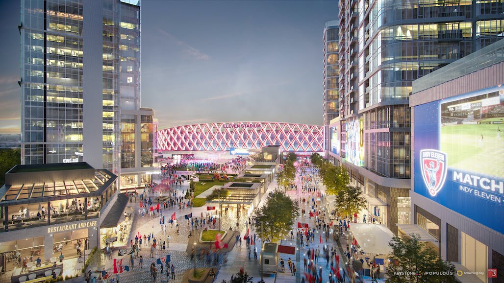 Populous透露了其在印第安纳波利斯新建的20000座多用途足球场的设计。这个大型综合用途开发项目包括公寓、酒店特色、办公空间和零售店,所有这些都包裹在一个变色的LED立面中。
