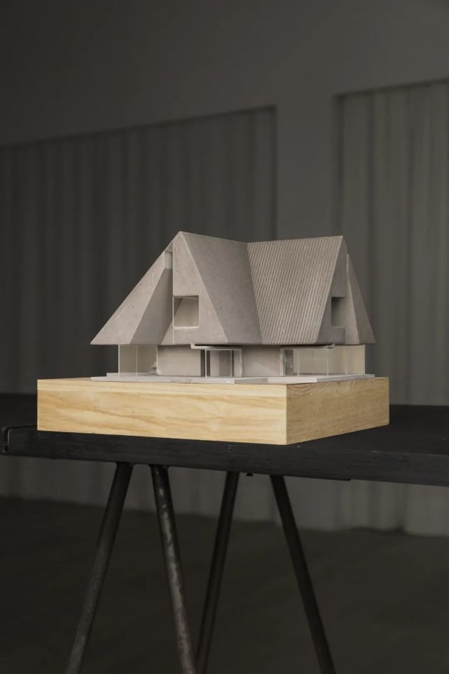 步入纪念花园之前,屋顶上方的一处切空将一棵小树轻轻框入。阳台与天窗井从坡屋顶的立面中雕刻而出,光滑的屋顶外部过渡到内部木板纹理的混凝土。