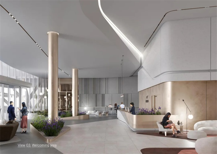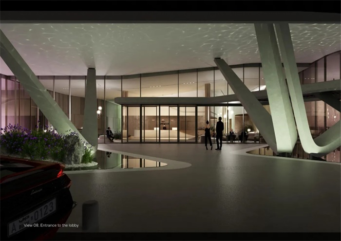 继承了海边建筑的曲线语言,Iconic Tower的裙房31米高,共设有6层,入口处7.5米高的V形柱不仅并反射着星点水景中的粼粼波光,也成为室外到室内的过渡空间语言,带有速度感和雕塑艺术感,模糊了建筑内外的边界。