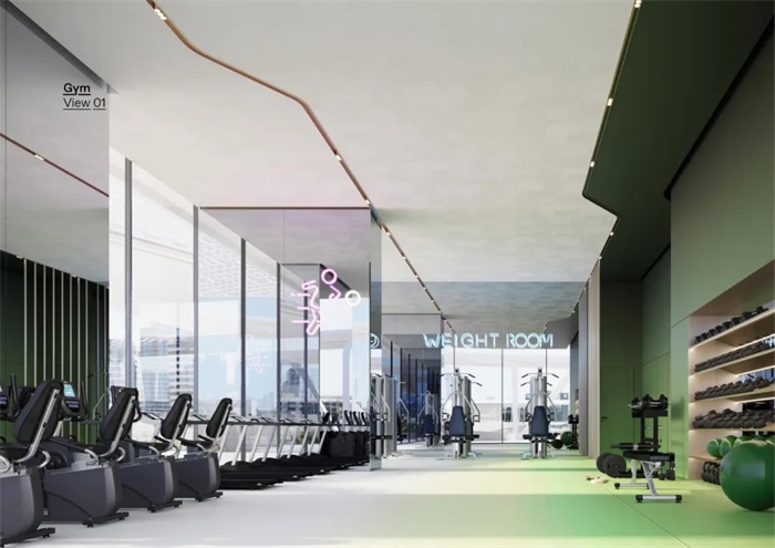 时尚的渐变色健身房中,装饰着带有时尚意味的霓虹灯标志,梯度尼龙地板与渐变绿色的抛光灰泥彰显出蓬勃的活力。