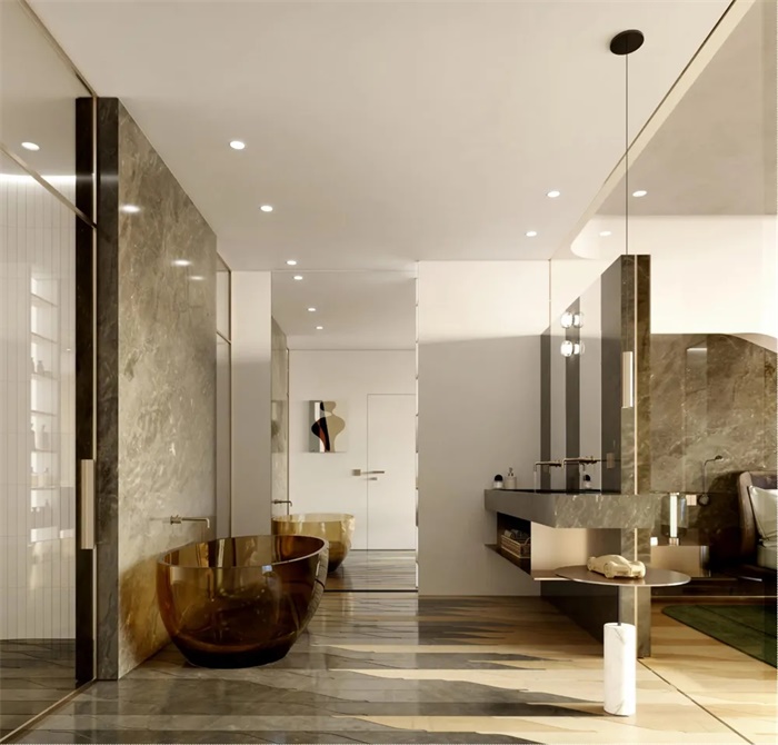 盥洗室尤其选择几乎看不到框架的玻璃与石材结构,生活品质一以贯之。此外,由于独特的建筑造型,公寓外侧自由蜿蜒的阳台形式多种多样,与之相关的户外生活方式定制也多达九类。