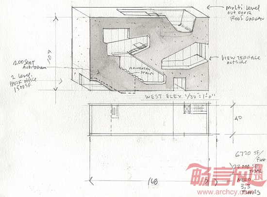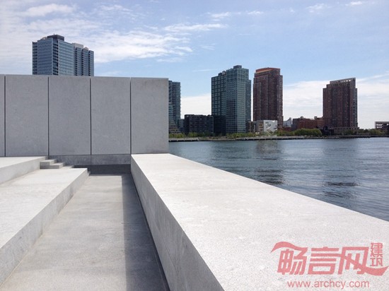 面朝曼哈顿壮丽景致的东河基地启发了设计灵感,该设计将室内主流动路线切入西立面。一个“曼哈顿风光”楼梯自开放的到达区立起,给了使用者一个朝向城市的巨大的美丽视野。楼梯侧面是垂直排列的书桌,在逐层上升的剖面可看到摆满书册。自入口处能见到书籍满目,而拾阶而上则可俯瞰东河,欣赏到曼哈顿的景色。