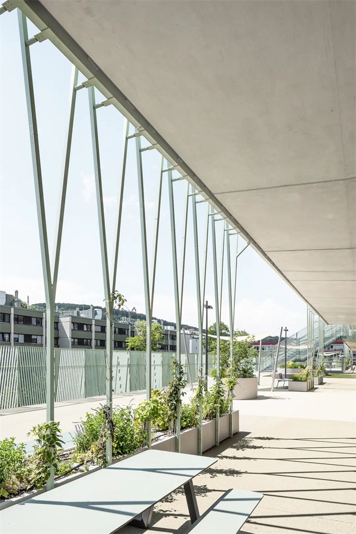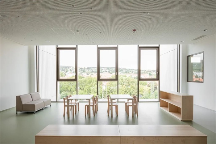 这座简洁、独特的学校拥有南向的阶梯式建筑。每两层为一个层级,每个层级都拥有宽敞的露台直接连通教室和带有大窗户的休闲空间。阶梯状的南立面、底层的长廊和室外操场共同形成了一个经过精心设计色景观,与之相对的是北立面设置小窗户,以此避免来自北侧铁路的噪音。设计通过将中学部分建筑体量与铁路平行布置,在南侧入口大厅和长廊周围为儿童和邻居创造了一个安静安全的区域。