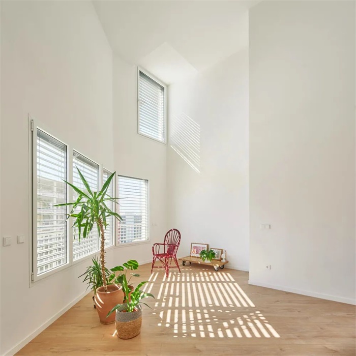 该建筑高 5 至 8 层,有 4 个庭院紧邻现有建筑的党墙庭院。这一项目决定产生了大面积的内部庭院,如果与相邻建筑的庭院相加,其面积将增加一倍。每个庭院都是一个独立的入口,有自己的外部通道和垂直交流核心,尽管它们都集中在停车场一层。