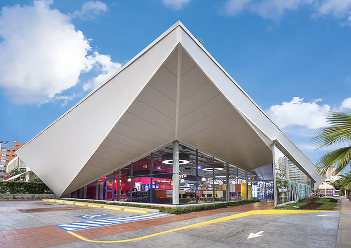 De Candido Express超市毗邻Maracaibo市最为繁忙的街道,项目由NMD Nomadas建筑事务所设计。项目概念旨在显示地域特征,表达成简介、坚定、多样性和持续的特点。建筑设计能够很好地适应未来变化要求,用于不同用途和城市场景。建筑师希望超市具有区别于其他建筑的独特性,其屋面采用了折纸灵感,没有设置支撑墙面。其简洁性和柔软性和日本折纸如出一辙。