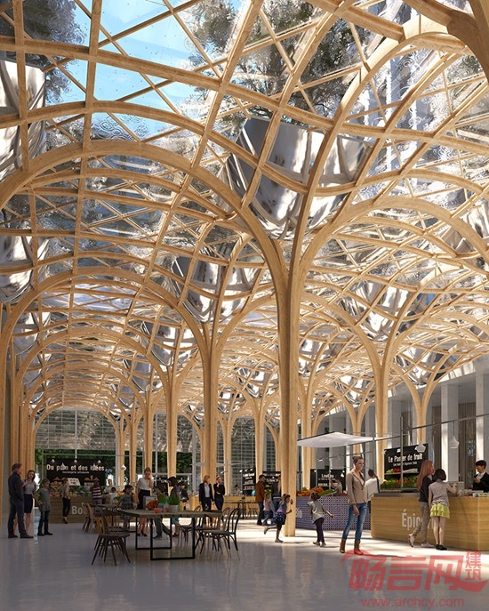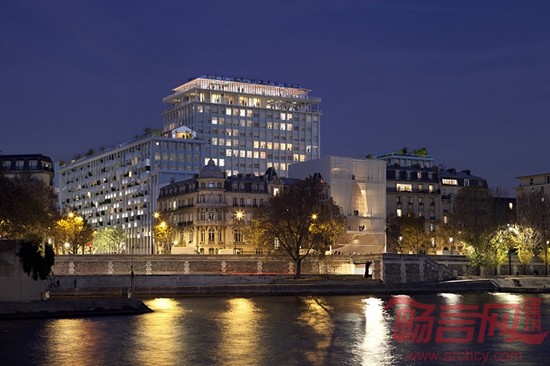 一个巨大的蛋形结构出现在大楼中央,其内部为一些对自然光线要求低但私密性要求高的场所,比如音乐厅和各种展览厅等。项目后部,在如波浪起伏的木制顶棚下,有大型的咖啡厅和市场。夜间,灯光开启时,整栋楼仿佛塞纳河畔的灯塔,吸引路人前来。