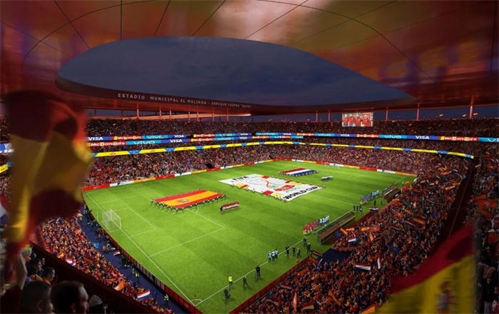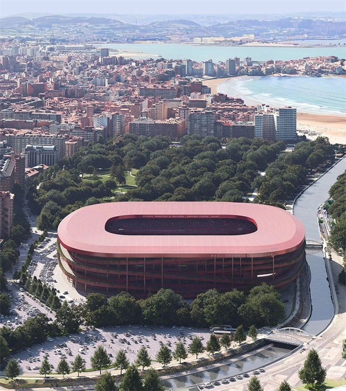 西班牙阿斯图里亚斯成为 2030 年世界杯主办城市之一,Sordo Madaleno与 Orlegi Sports 联合提出了对希洪皇家体育俱乐部主场 El Molinón体育场进行翻新和改造的方案。该项目将覆盖与希洪市相连的约 8.8 公顷公共空间,并将临时增加座位,以便在世界杯期间在 33,650 个固定座位的基础上再容纳 9,000 名观众。作为西班牙最古老的专业足球场,El Molinón 体育场具有重要的历史意义;因此,该项目的主要目标是翻新和加强现有的体育基础设施。