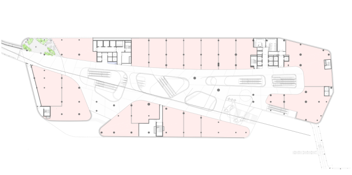 设计以“连续的环”为概念,将酒店和购物中心衔接在一起,使得裙楼和塔楼之间,以及各功能之间的融合更加直观。塔楼的连续线条在视觉上削减了裙楼的体量,并创造出一个在所有方向上都不对称的结构。