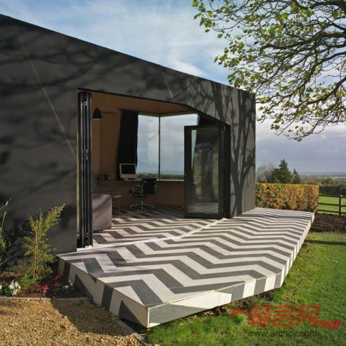该建筑坐落在一个混凝土台面上,上面铺着黑白相间的V形图案瓷砖,高出花园的地平面形成了一个车库入口、一个花园台阶和一个阳光露台。