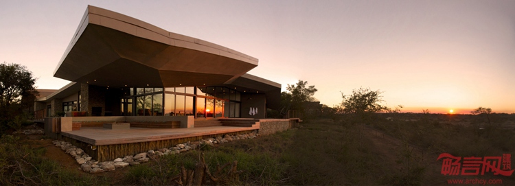 Architects Justice事务所的建筑师Granicki完成了一个不同寻常、充满创意的度假住宅设计,他得到了业主的合作,后者立即对其方案表示认可。该项目位于南非Mjejane私人禁猎保护区,周边的环境证实了挑战的独一无二,中空的屋面不能有敞开或入口,否则不同种类的动物就会占据建筑,同时要采取措施,阻止疣猪在北侧的木质露台下方栖息。房屋的“王冠”是一个漂浮的钢铁屋面,遮盖了房子的各个方向,突出长度达到了最小值,仅有1.6米。而屋面伸出的最大值达到了令人惊叹的13米,悬挑以无支撑的状态呈现出蝴蝶般的优雅。总屋面面积达到450平米,而建筑总面积达900平米,室内区域同室外轻而易举地实现了融合。