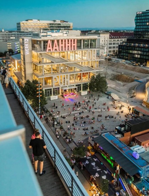 慕尼黑Werksviertel 商业区将前工业场地转型为集住宅、商业、社会和文化活动于一体的独立街区,并设有开放公共空间以供各类活动与娱乐使用。