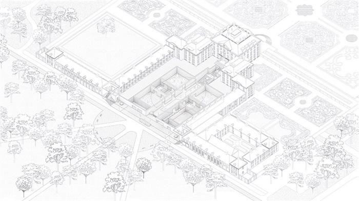 设计团队考虑到了建筑和景观之间不可分割的联系,将整个扩建工程置于地下,新的水景被整合为建筑的一部分,延续了传统的整体构图,并且不会破坏宫殿的历史形象。巴塞库尔(Bassecour)坐落在宫殿两翼之间,它以前是一个带有花坛和马槽的庭院。如今它已被改造成一个令人眼前一亮的空间,这里有一个中央喷泉和四个玻璃表面,每个表面都用天然石材和一层薄薄的流水装饰,这一设计做法也是向过去花园中的水厂致敬。