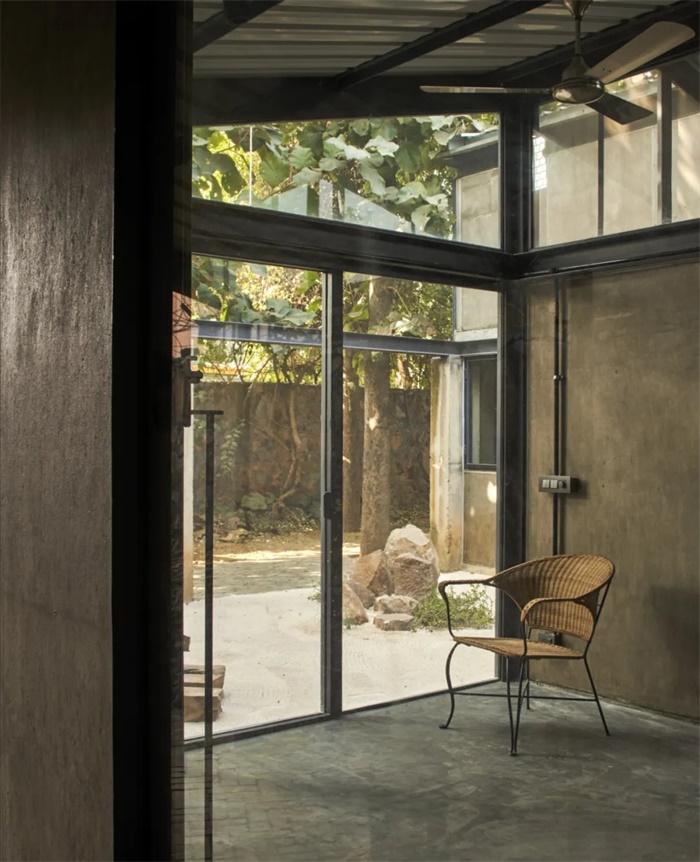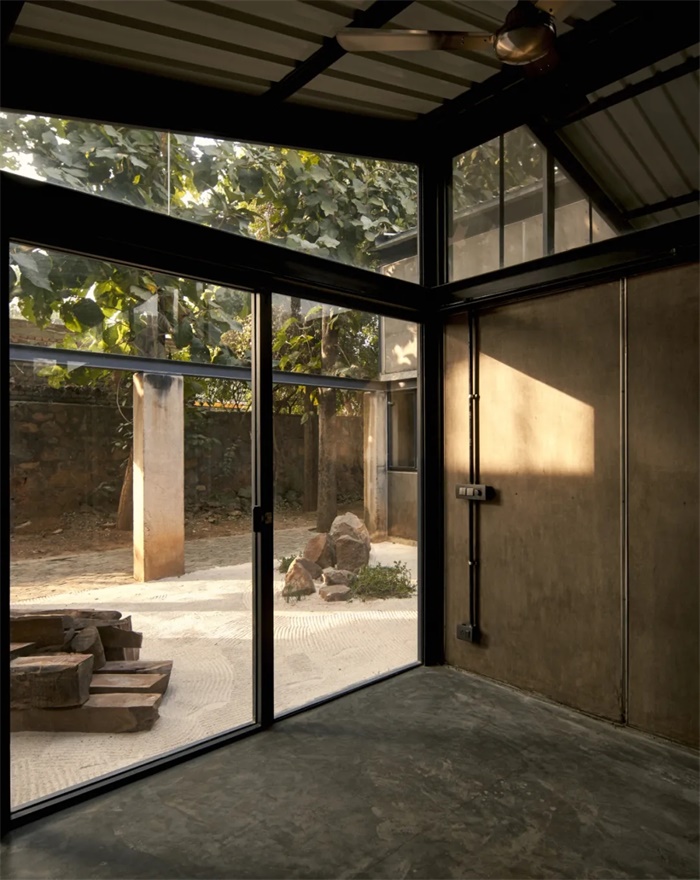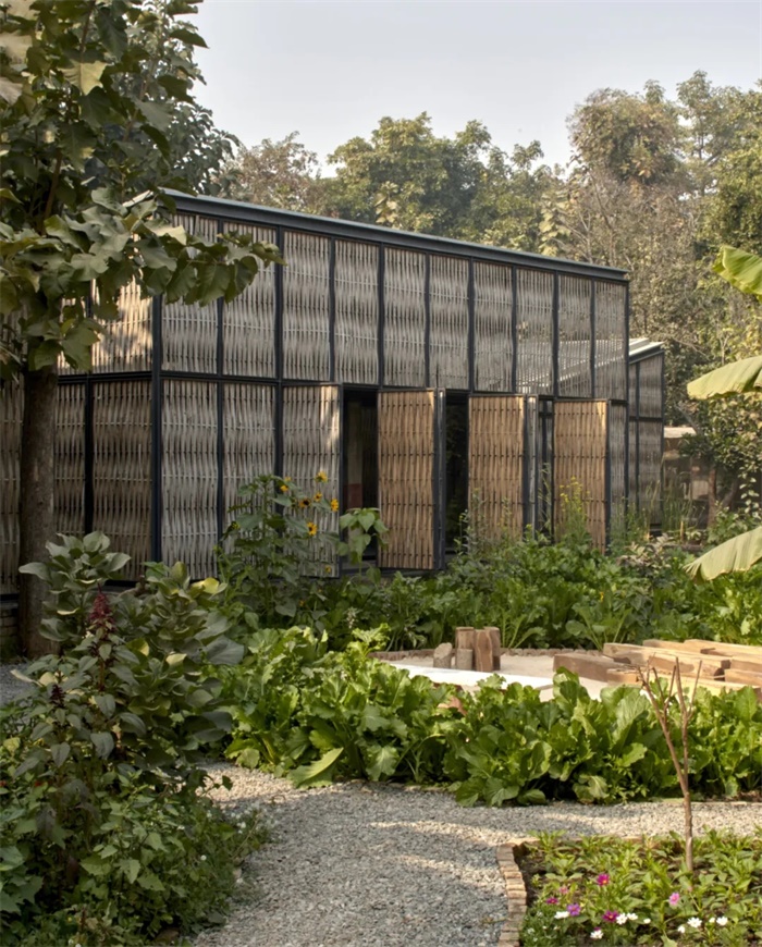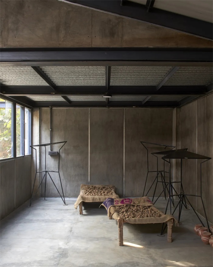 Studio Array 受邀在此打造一个能让来访艺术家与自然栖息地建立联系的空间,将他们从繁忙而苛刻的城市生活中解脱出来。团队并没有从零开始设计,而是有意识地利用现有的立柱系统和地基等半成品。为了延续客户的生态文化主义思想,设计力求减少浪费,保留了多年前已经建造的基础设施,并将其包围起来。由此,艺术家驻地“覆盖”和“包裹”了旧的结构,同时通过轻质钢材、玻璃、竹子和木制墙体的介入创造了结构上的对比。建成后的艺术家驻地将在未来接待来自印度和国外的艺术家。