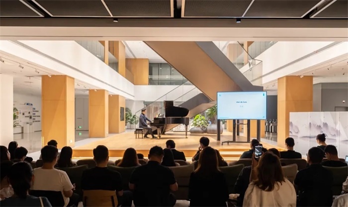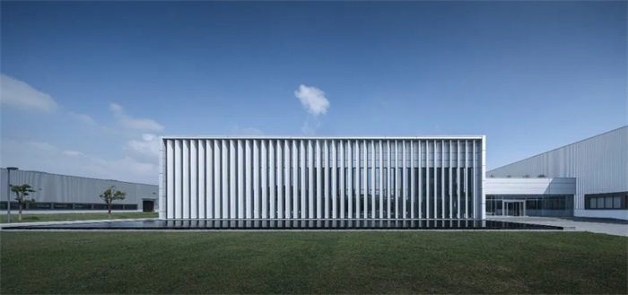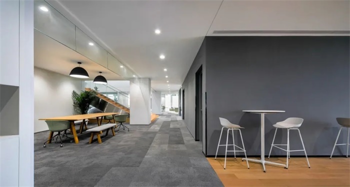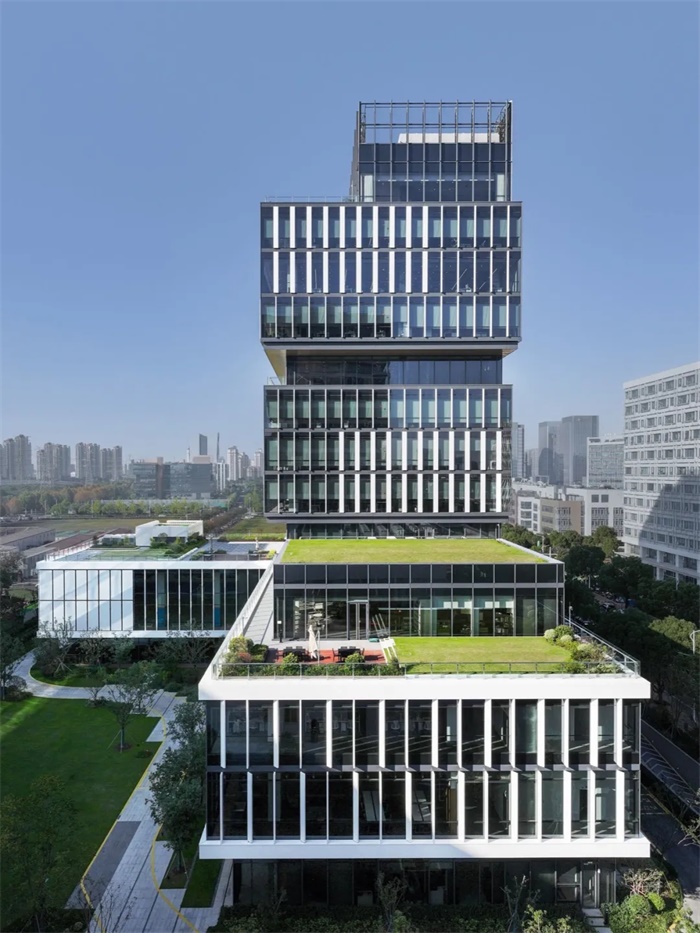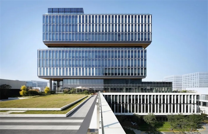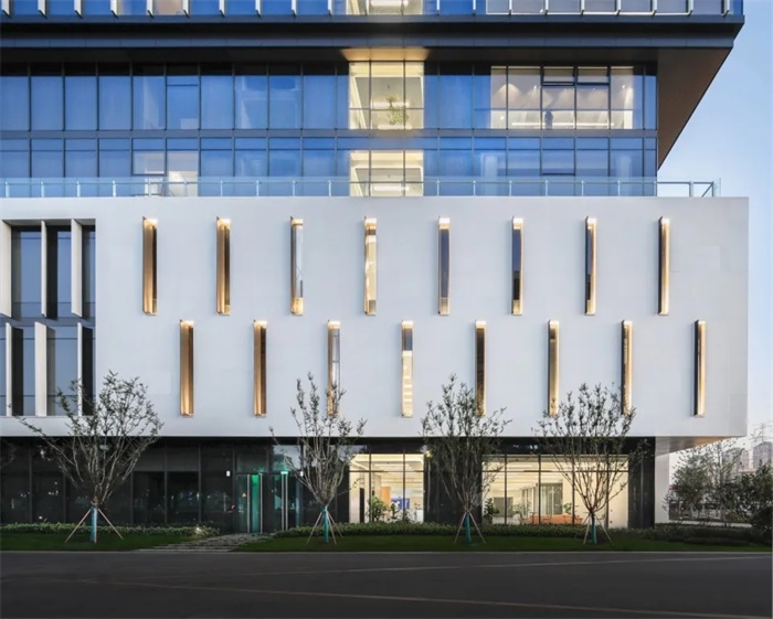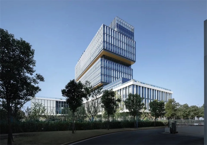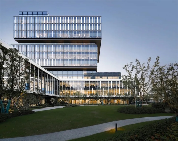 对细节的把控主要体现在造型背后一些不同寻常的数字,4.5m的层高大于大部分办公建筑,入驻的软件工程师们未来很容易感受到这种更为宽敞的空间带来的不同体验。1680mm面宽的玻璃幕分隔单元也大于常规的办公建筑。“更舒适的视野或许可以与人们的思维产生有趣的共鸣”,设计师们曾经这样“推销”他们的幕墙建议,而正是这一组组看起来平平无奇的玻璃已成为众多项目参与者共同的“难忘回忆”。由于疫情期间种种的困难环境,几个月的反复选样令大家身心俱疲,但最终建设团队还是坚持着等待到了最适合这栋建筑气质的玻璃色彩。